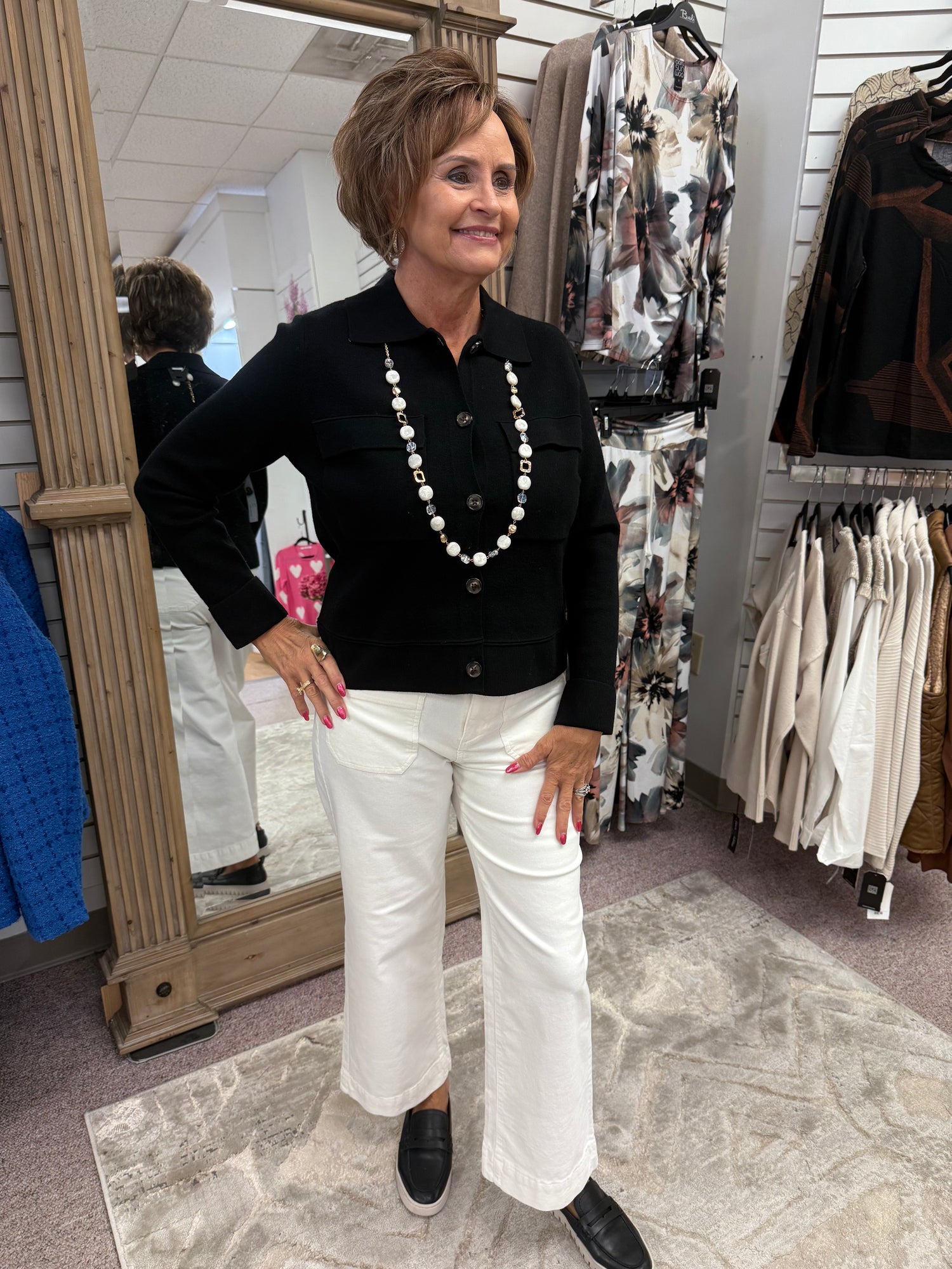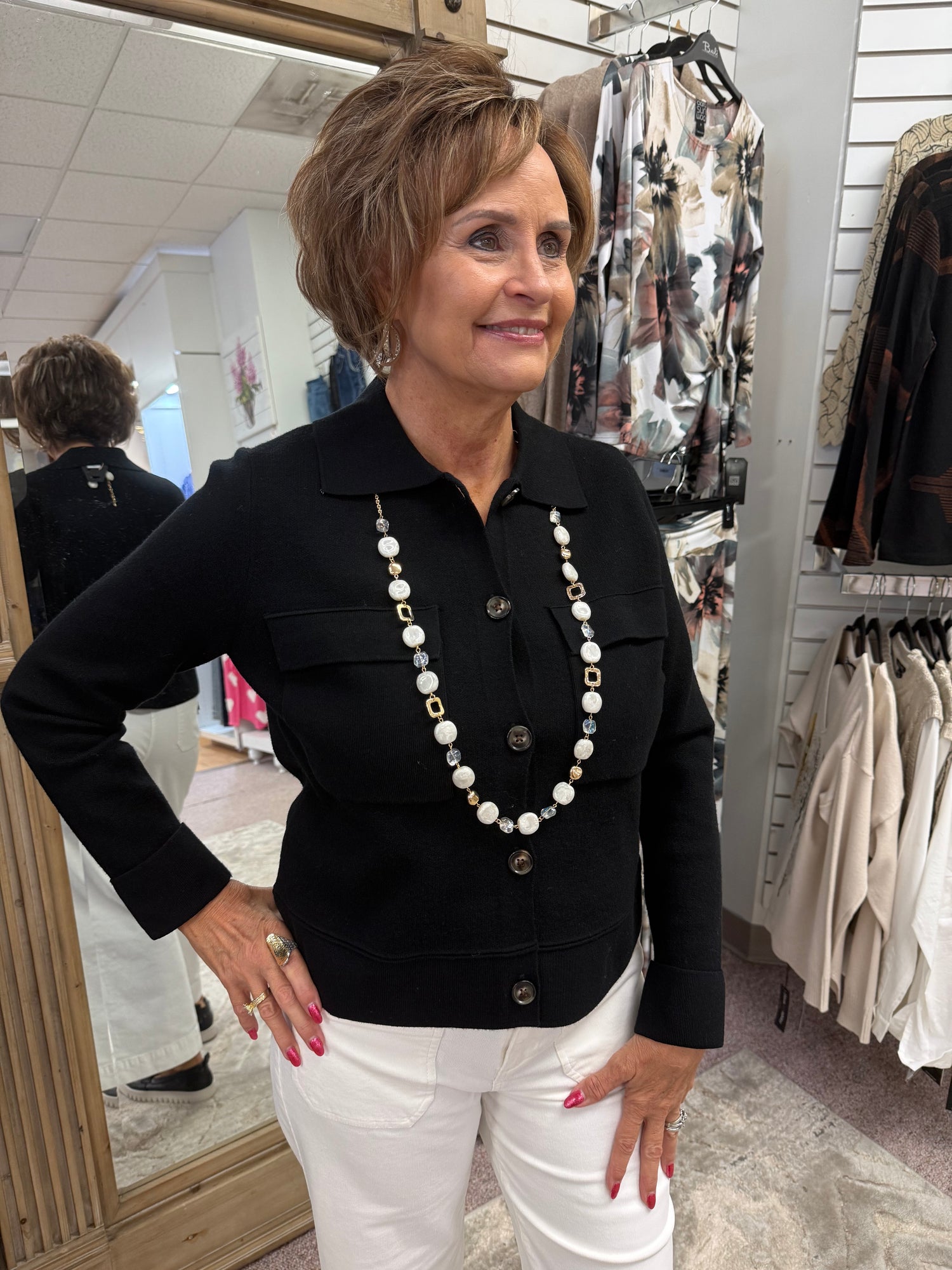 A seamless blend of laidback comfort and structured shape, this collared sweater cardigan puts forth a sophisticated style that's easy to wear. It features a long-sleeve design, faux horn button closures in the front, and double knit jacquard fabric that's soft and smooth.