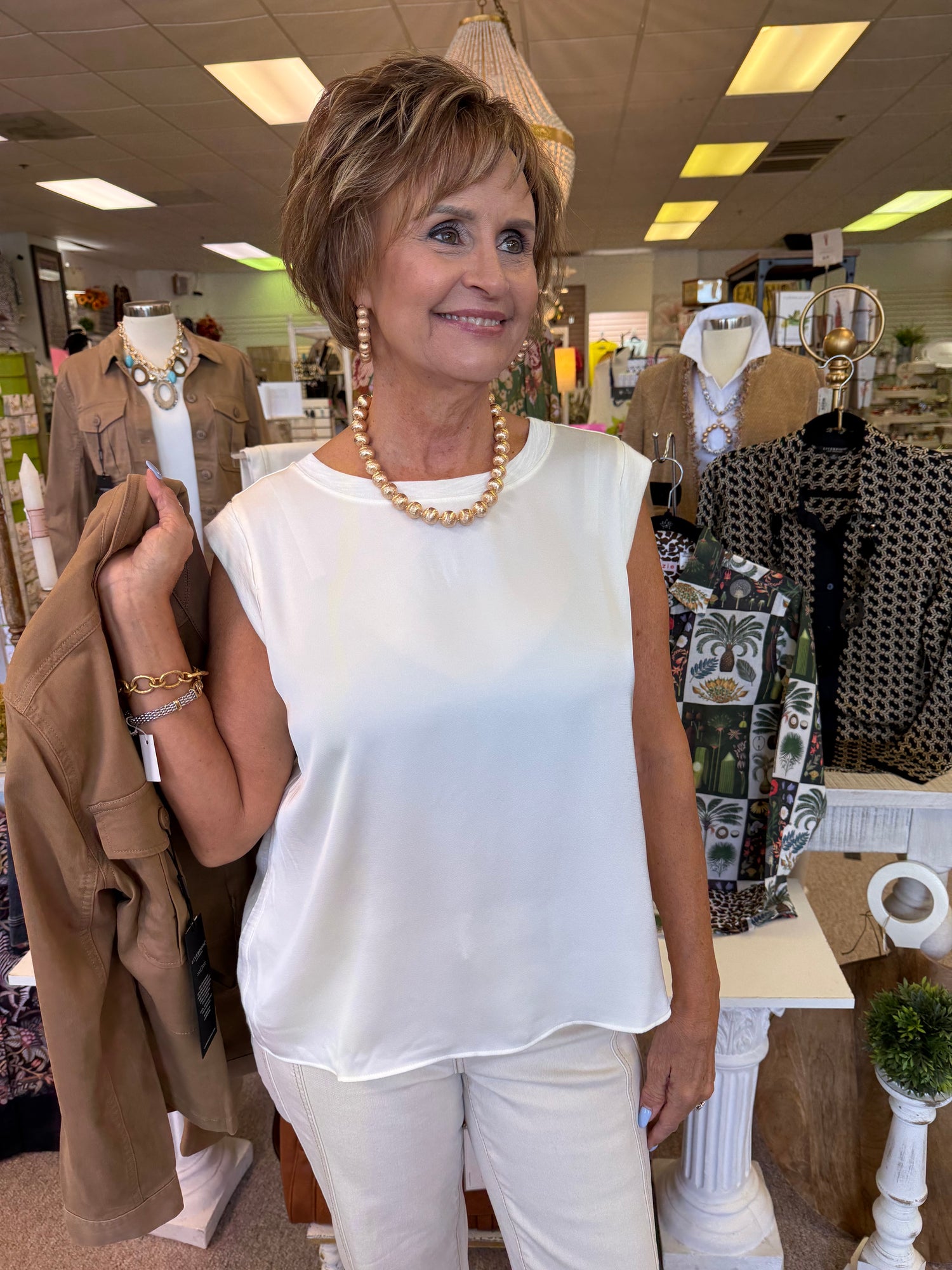Where polish meets ease. This sleeveless top pairs a woven front for a clean, structured look with a soft knit back that moves with you. The result? A versatile piece that balances texture and comfort—effortlessly refined from day to night.