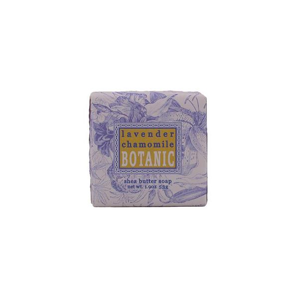 French milled vegetable soap with moisturizing shea butter, cocoa butter, and fragranced with relaxing lavender and chamomile essentials oils.