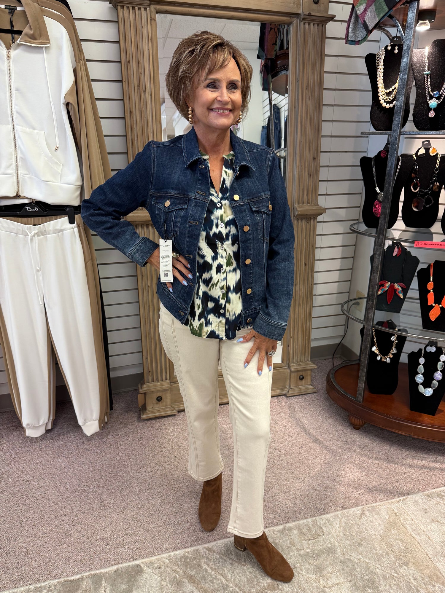 Our classic denim jacket features a unique ombre denim wash, golden hardware and excellent comfort and stretch. Look good and feel amazing in this jean jacket.