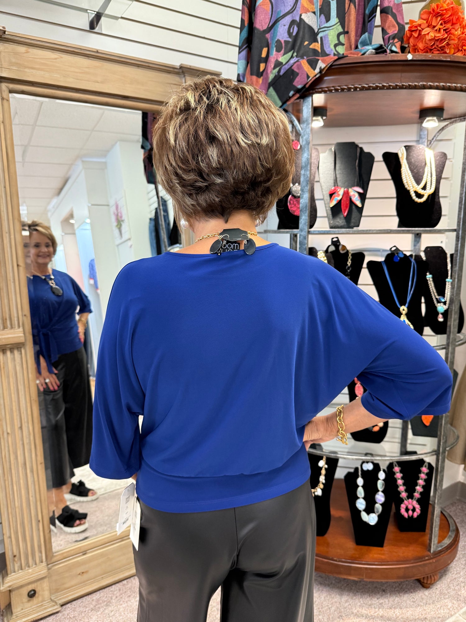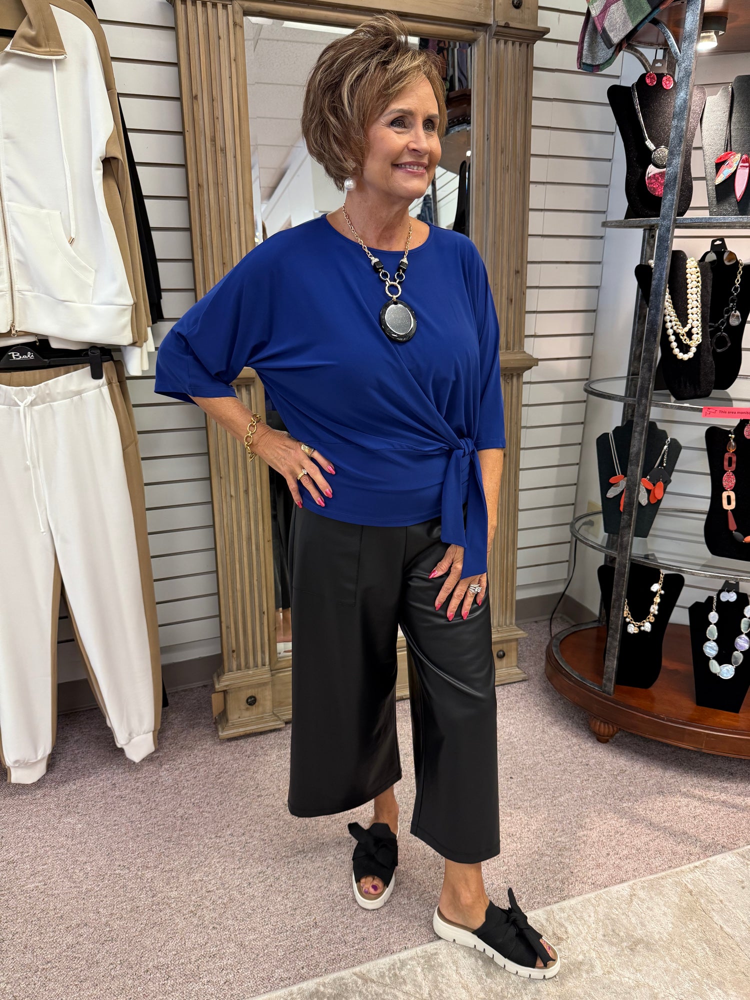 Our Side Tie Top will have you looking chic from all angles! Featuring a high round neckline, elbow-length sleeves, and side tie detail, with a waist-hugging hemline, that displays an elegant blouson silhouette.