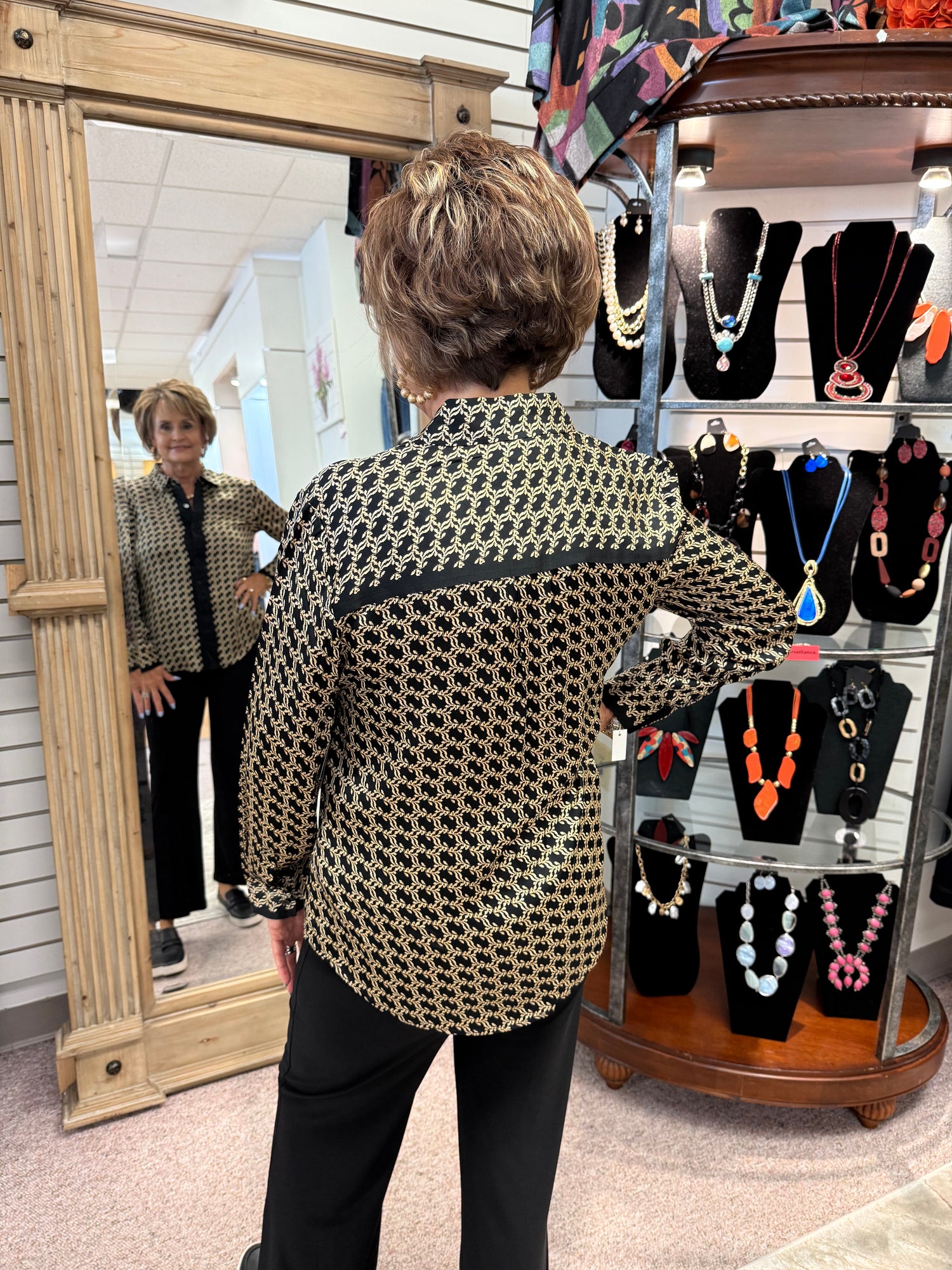 This button-front shirt makes a striking statement with its Black Gold Combo print, elegant and graphic, designed to be uniquely yours. Designed with a classic collar, curved hem, and subtle back pleat, it drapes effortlessly whether worn tucked, untucked, or layered under a jacket. Sleek enough for the office, bold enough for after hours.
