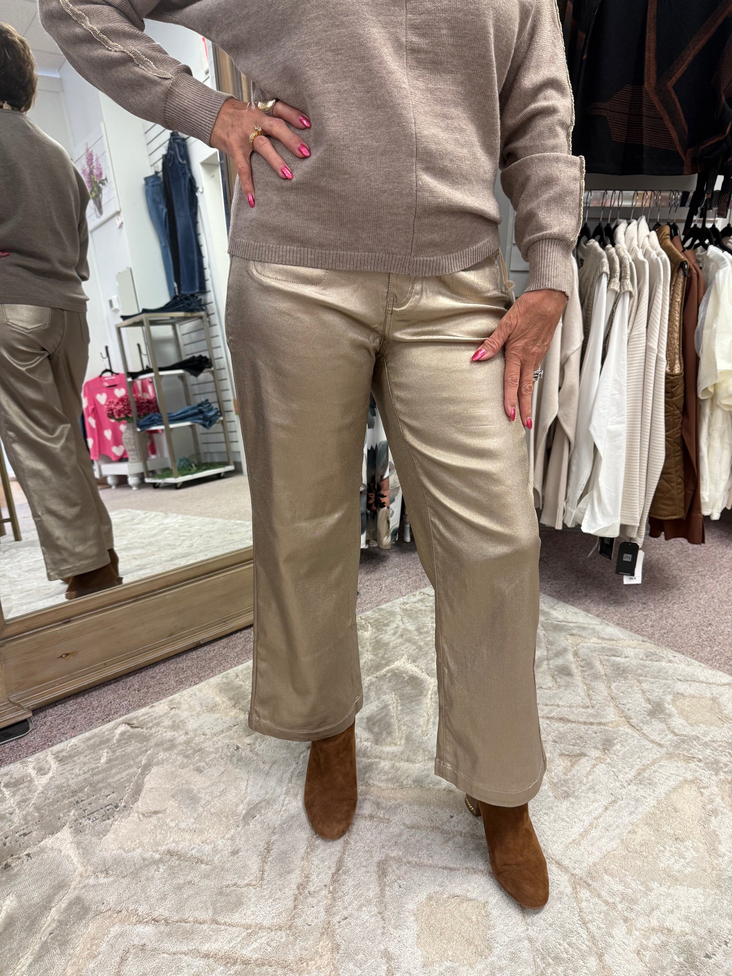 Metallic Wax Flared Pants in brilliant gold brass are perfect for stepping up your style. They feature an eye-catching metallic finish that gleams as you move. With a flare leg design and front welt pockets, they offer a modern touch suitable for evenings out or special events. Pair them with either a sleek top or a cozy knit to make a statement this fall.