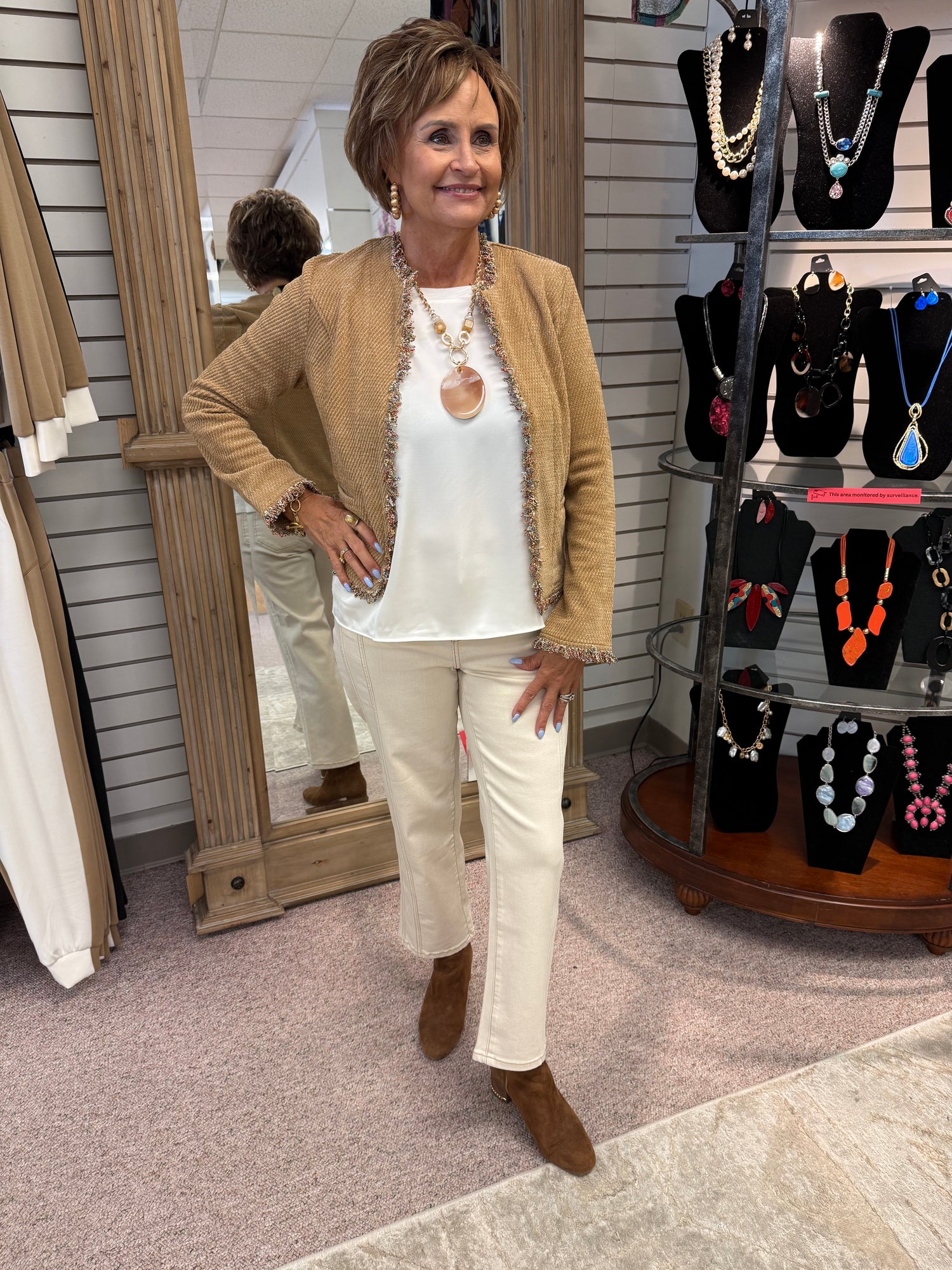 - Set in waistband with belt loops