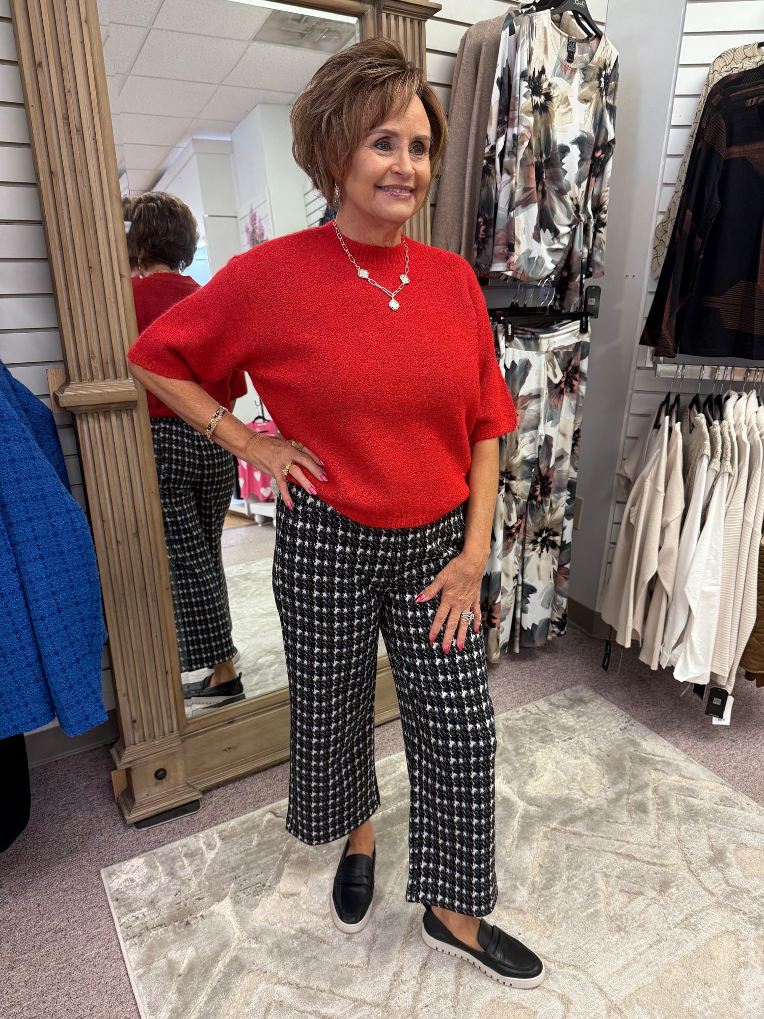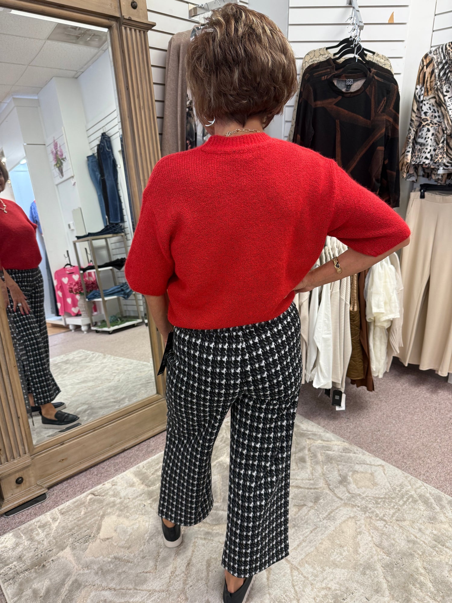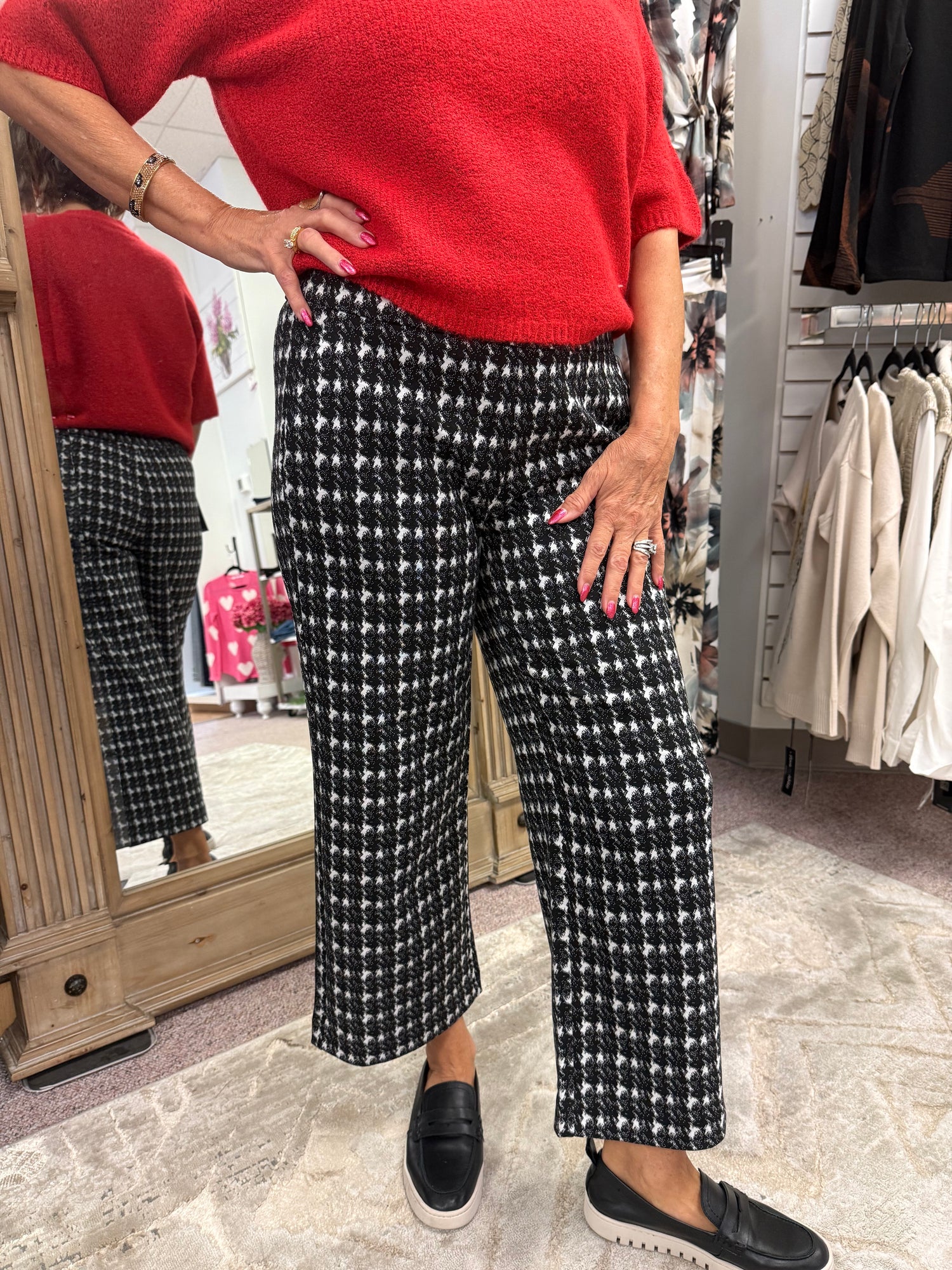 pattern meets polish. The Mabel Crop brings ease to tailoring with a modern wide-leg silhouette in our black-and-white smudge check. Designed with a pull-on elastic waistband, this cropped style delivers comfort without compromising on style. A versatile piece that pairs effortlessly with knits, blouses, or blazers.