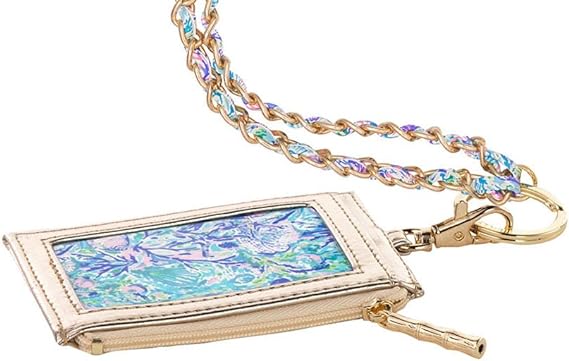 - Lanyard features the pattern, Soleil It On Me, threaded through gold chains for the perfect balance of ease and glamour. Mini wallet is featured in shiny gold and has a Lilly logo plaque on one side